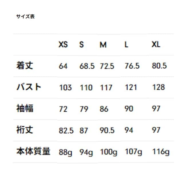 重さ:XS(88g) S(94g) M(100g) L(107g) XL(116g)