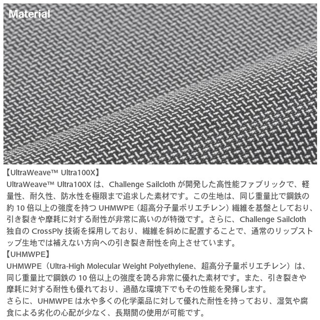軽量性、耐久性、防水性があり強度の高い「UltraWeave Ultra100X」素材を使用。