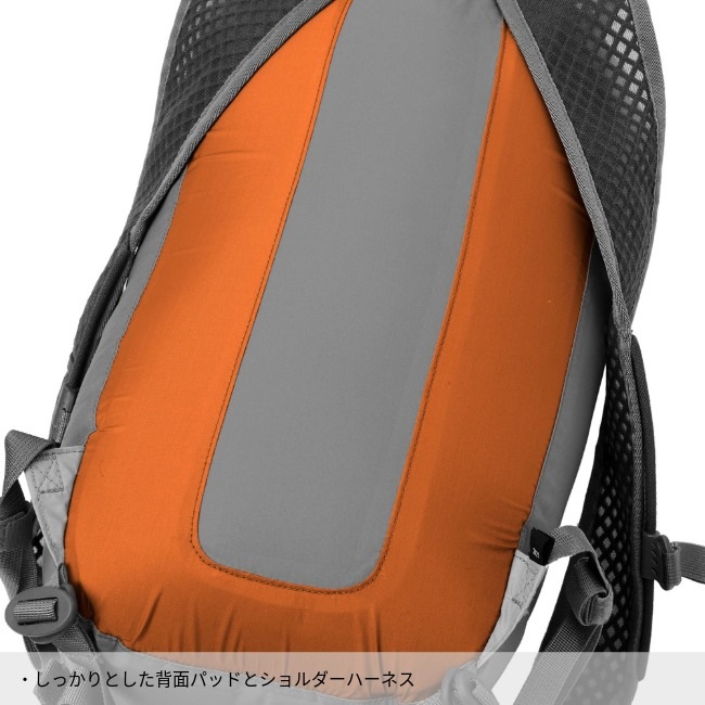 余計な物のない非常にシンプルな作りながら、しっかりとした背面パッドとショルダーハーネスがあり、デイハイクやアタックザックとして、十分背負える仕様です。