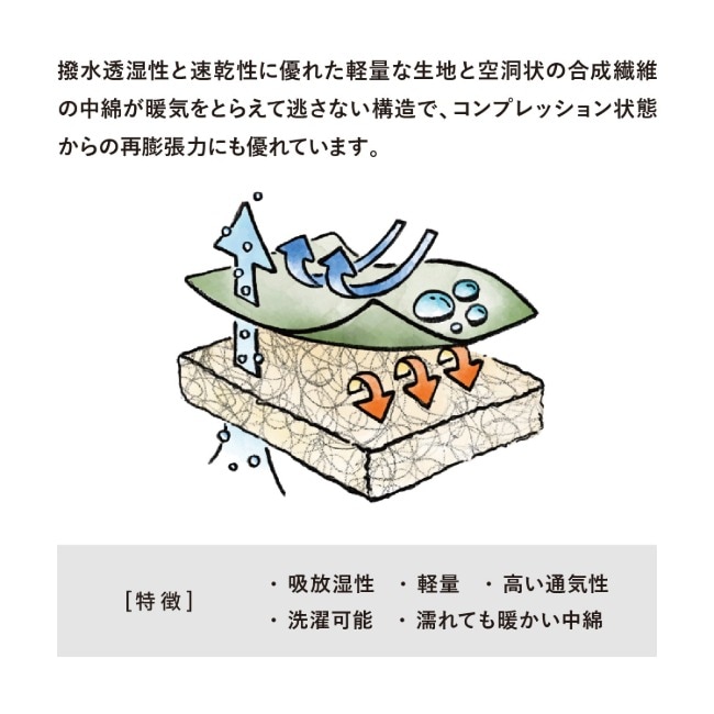 ●中綿には再膨張力に優れた「ISOFIBRE」を使用。シリコーン処理を施した空洞状の合成繊維は空洞部に暖気を捉えて逃しません。