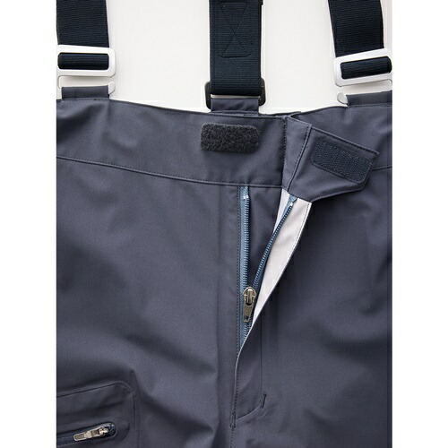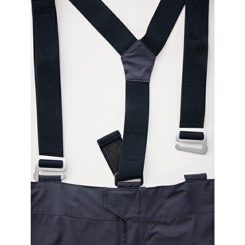 着脱が容易なフルサイドジッパー、細身のシルエット、ハーネス使用を想定したウェスト周りの仕様、着脱可能なサスペンダー。