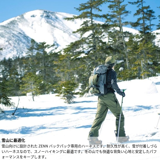 【パーゴワークス PAAGO WORKS ZENN スノーハーネス】 雪山でもZENNを。 スノーハイキングに最適化したハーネスです。 (ZENNバックパックの全サイズに対応) 【SEPC】 適応身長:155~180cm ショルダーパッド厚:10mm 背面パッドの長さ:32cm ハーネスの長さ:45.5cm 重量:233g 素材:ナイロン ※本製品はZENNバックパック(25L/35L/45L) 専用のハーネスです。他のバックパックにはご使用いただけませんので、ご注意ください。